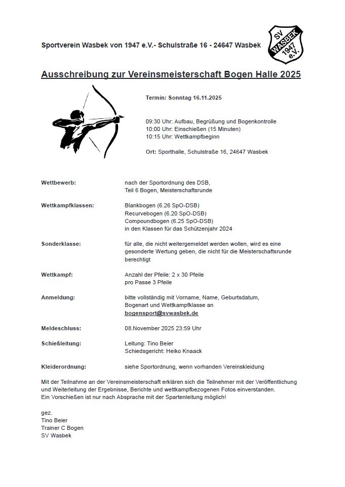 am 16.11.2025 ab 10:00 Uhr wird die 2. Vereinsmeisterschaft Bogen Halle des SV Wasbek ausgetragen. An diesem Tag findet kein Training statt, Zuschauer sind jederzeit willkommen.